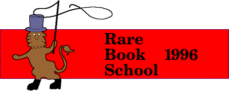 BOOKS AT VIRGINIA: RARE BOOK SCHOOL 1996Books at Virginia: Rare Book School (RBS) offers a collection of five-day, non-credit courses on topics concerning rare books, manuscripts, and special collections. Students make a full-time commitment to any course they attend, from 8:30 am to 5 pm, Monday-Friday; most students also attend an informal dinner on the Sunday evening before their first class on Monday. In addition to the formal classes, there are early-evening public lectures and other events throughout the four weeks of RBS. The educational and professional pre-requisites for RBS courses vary. Some courses are primarily directed toward research librarians and archivists. Others are intended for academics, persons working in the antiquarian book trade, bookbinders and conservators, students of the history of books and printing, and others with an interest in the subjects being treated. The tuition for each five-day course is $565. Low-cost, air-conditioned dormitory housing will be offered on the historic central grounds of the University, and nearby hotel accommodation is readily available. Students are encouraged to take advantage of RBS's housing to arrive a few days before their course, or stay a few days later, in order to give themselves (and their families) a better chance to explore the Charlottesville area, which includes many sites of historic interest as well as various vacation attractions. For an application form and a copy of the RBS 1996 Expanded
