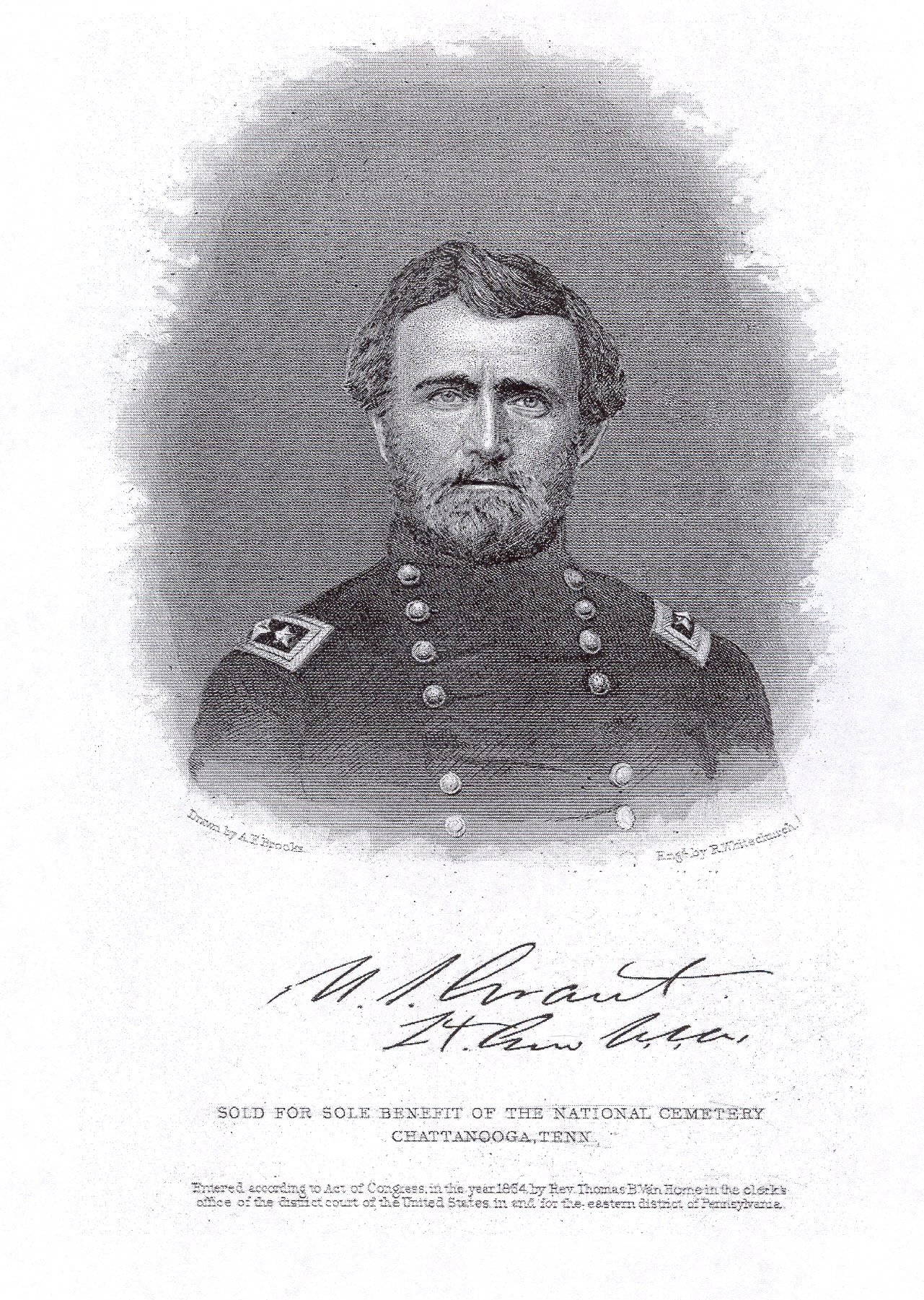 The plates have almost identical captions: “Sold for sole benefit of the National Cemetery | Chattanooga, Tenn.” All three images are identified in the plate as having been drawn by A. F. Brooks [in fact, all three derived from photographs easily found online] and engraved by R. Whitechurch. In small letters at the bottom of each of the plates is the boilerplate legend: “Entered according to Act of Congress in the year 1864 [for Grant; the date is 1865 for Hooker and Whipple] by Rev. Thomas B. Van Horne in the clerk’s office of the district court of the United States in and for the eastern district of Pennsylvania.”