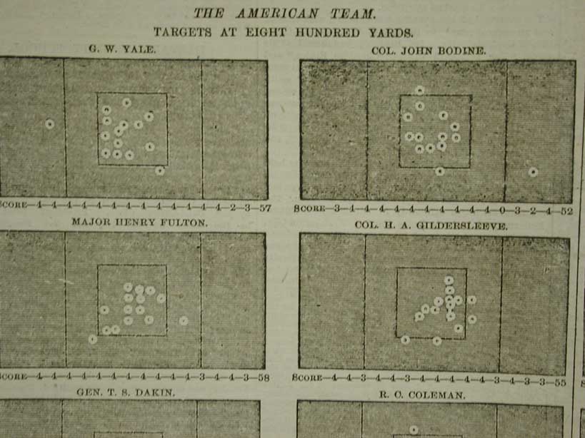 [ 10 April 2006 ] We recently added a copy of Henry Blackburn's The art of illustration (London 1894) to the RBS reference library. Blackburn informs us (pp. 21-22) that the first systematic attempt at illustration in a daily newspaper was the insertion of a weather chart in the Times in 1875, but that "in June, 1875, the Times and all other newspapers for England were far distanced by the New York Tribune in reporting the result of a shooting match in Dublin between an American Rifle Corps and some of our volunteers." To be sure, "there were long verbal reports in the English papers, describing the shooting and the results; but in the pages of the New York Tribune there appeared a series of targets with the shots of the successful competitors marked upon them, communicated by telegraph and printed in the paper in America on the following morning."