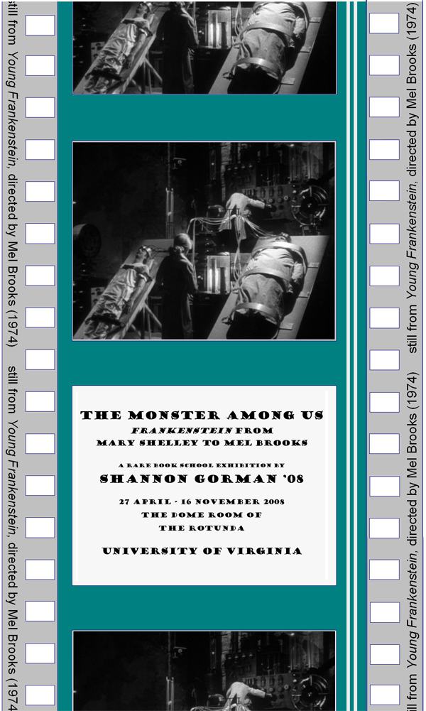 Most of the items on view in this exhibition were lent by Susan Tyler Hitchcock, whose interest in the Frankenstein myth culminated in the recent publication of Frankenstein: A Cultural History (NY: W. W. Norton & Co., 2007; see illustration to left). I am grateful to her for her mentorship, as well as her generosity in lending this material. I am also indebted to Terry Belanger, Barbara Heritage, Kenneth Giese, Ryan Roth, Dan Bryant, Paul Pugliese, Laura Barba, Kelly Webster, and Stephen Greenberg for their very different, but very important contributions, to this show.