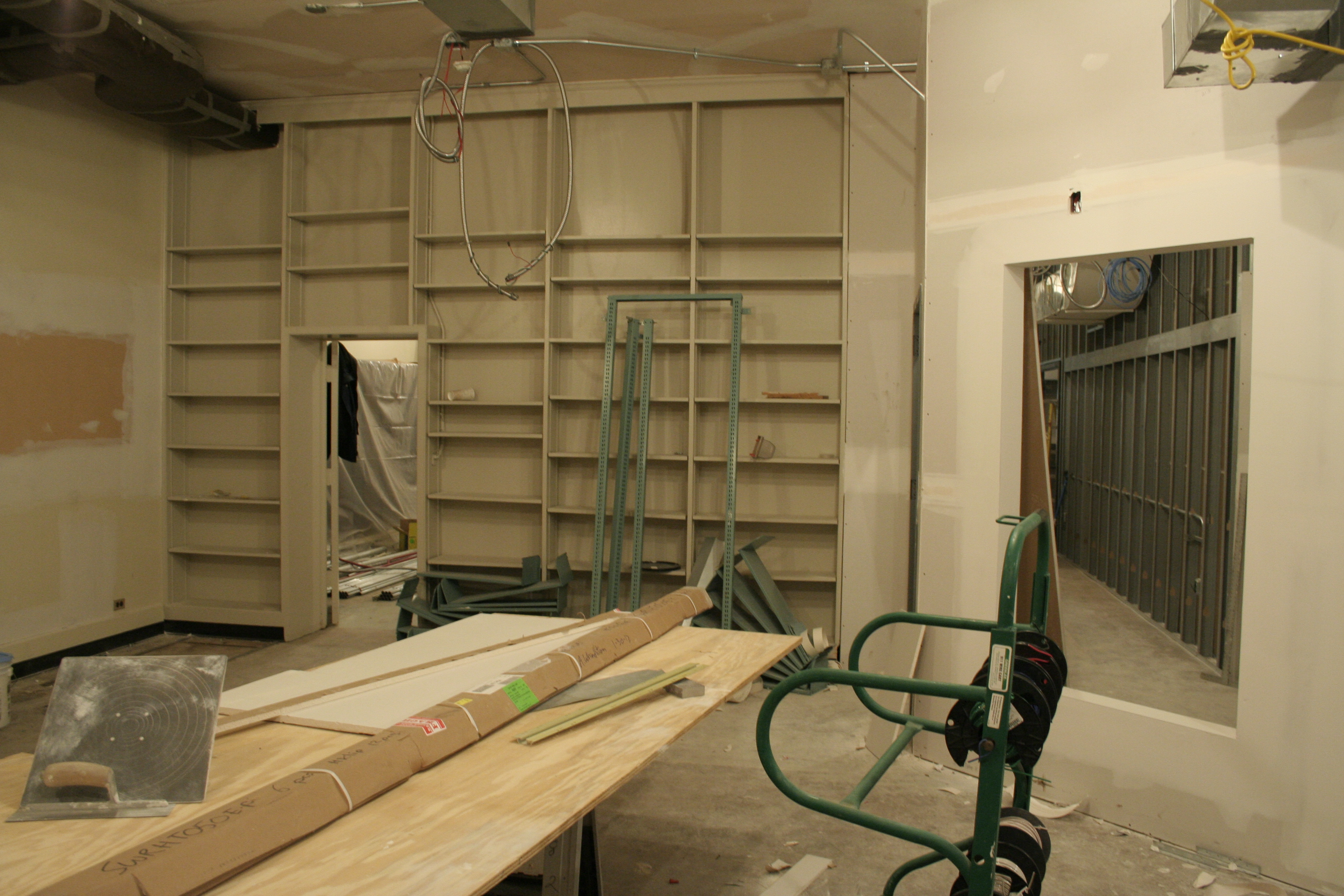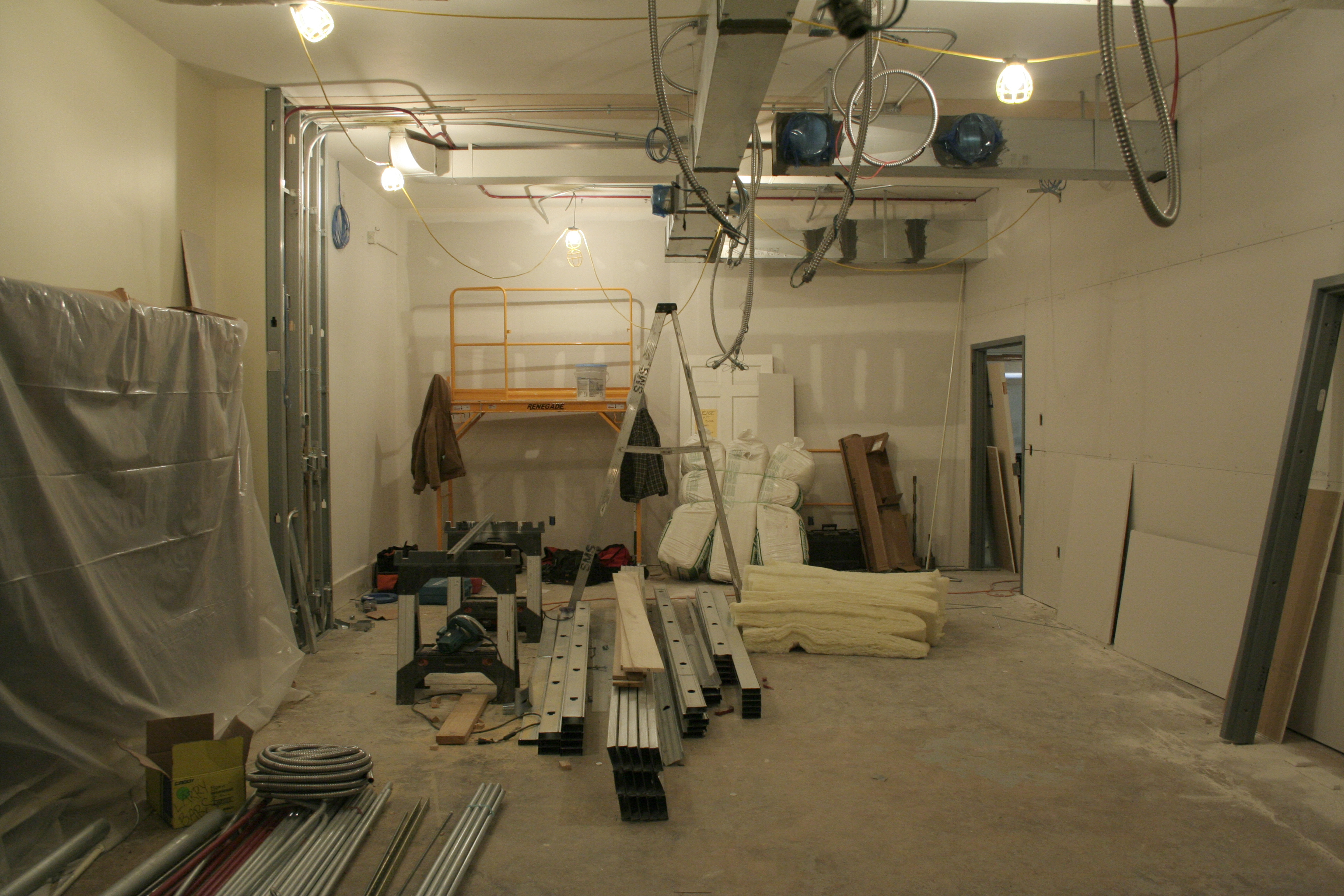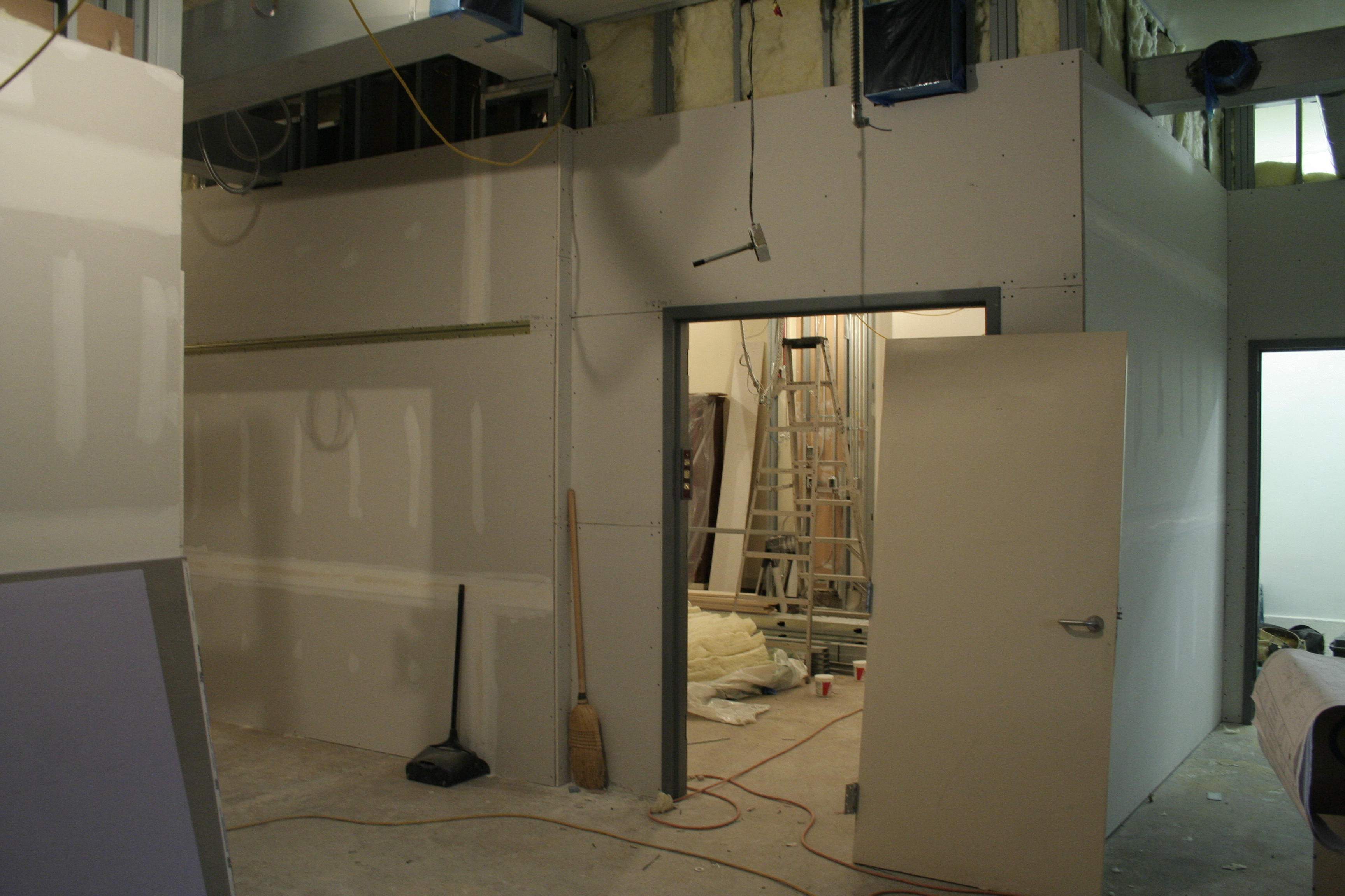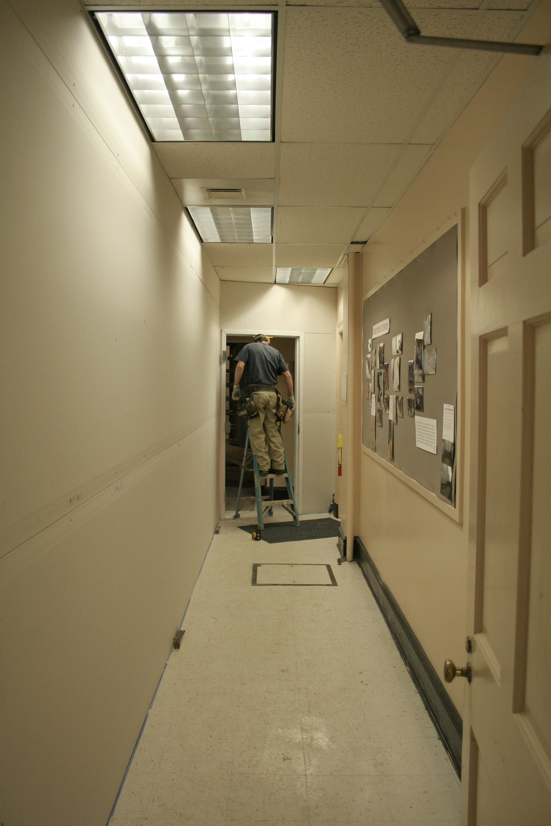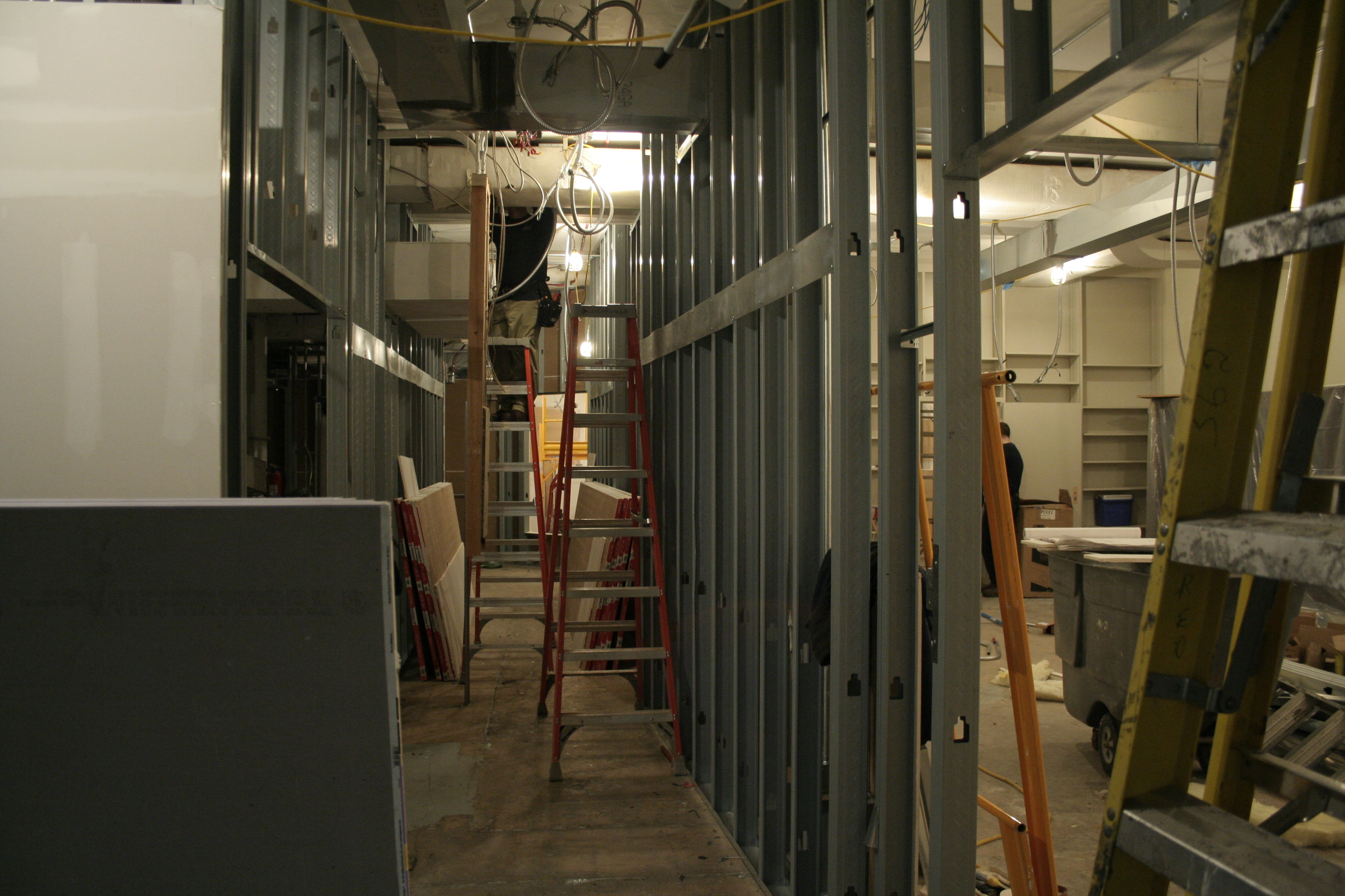 The vestibule and hallway, with walls installed (looking into Seminar B). |