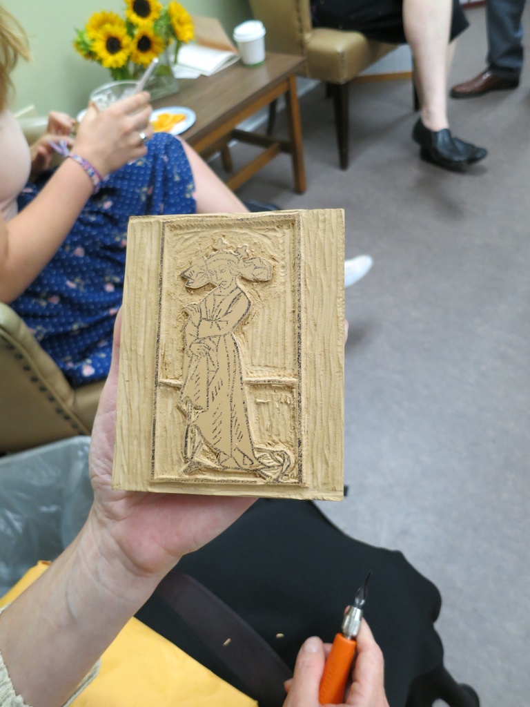 A student in the new Reception Area works on her "woodcut" for Terry Belanger's course Book Illustration Processes to 1900. |