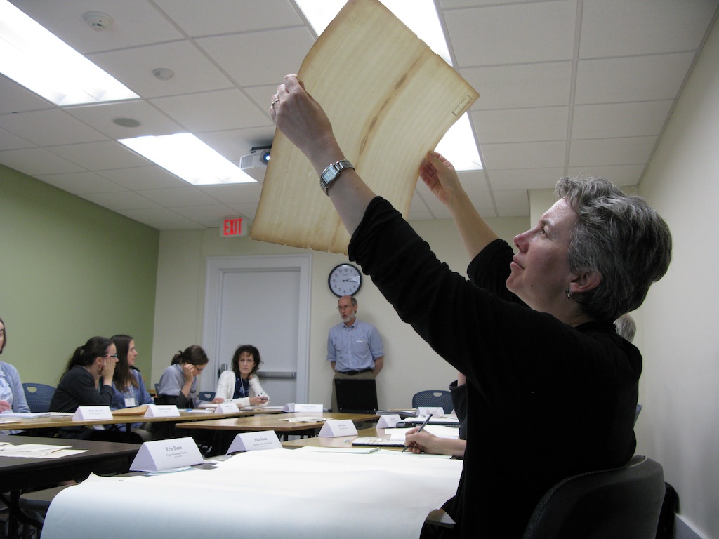 Observing paper chain lines in The History of European & American Papermaking, taught by Timothy Barrett and John Bidwell. |
