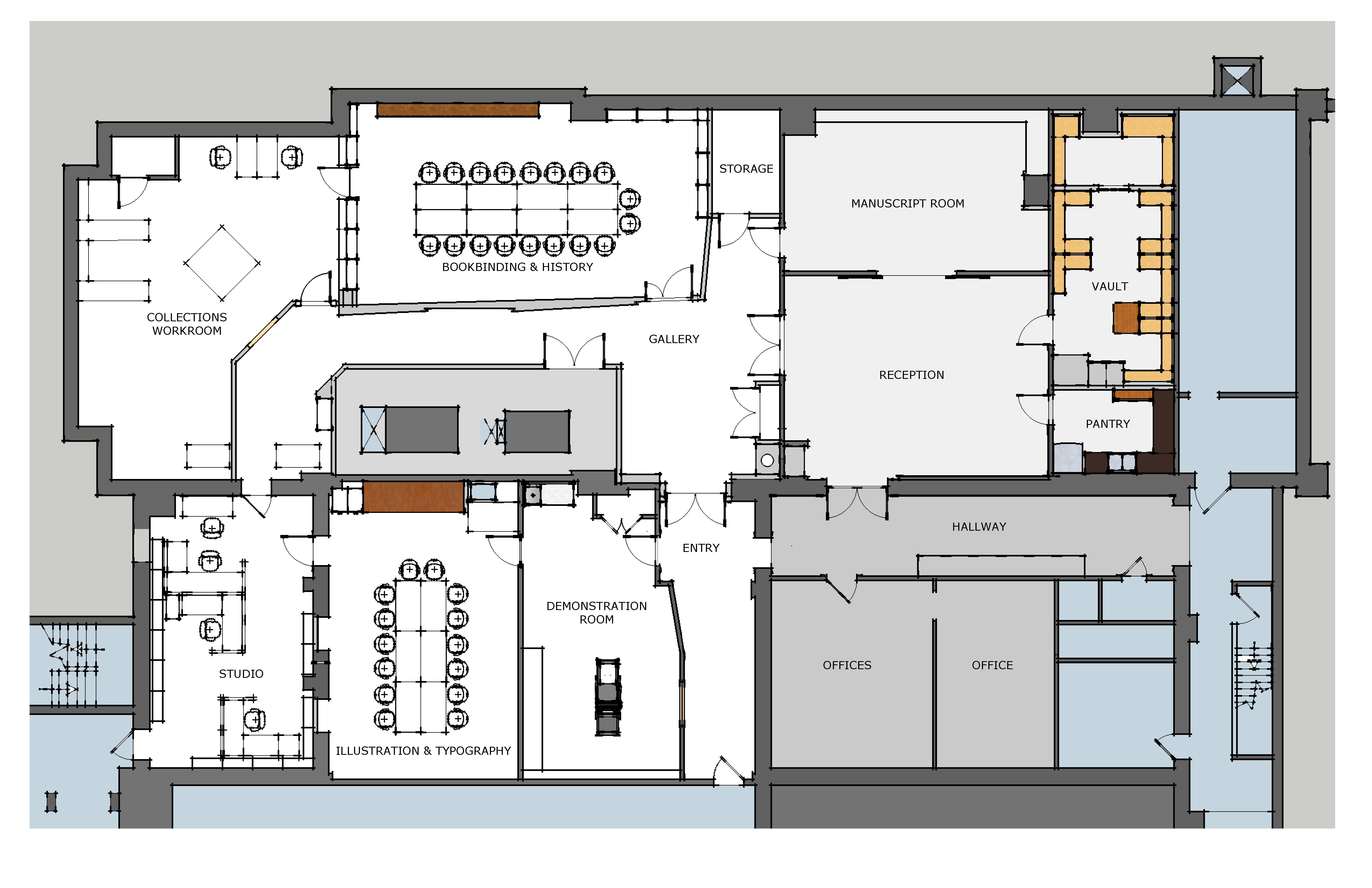 Our previous reception area, used for registration, breakfasts, and breaks, included the RBS Pressroom and part of a classroom. The Pressroom housed the majority of our type collection, a Vandercook 215 proofing press, and a six-by-eight-foot imposing stone. During our summer sessions, this space, roughly 400 square feet, fluctuated repeatedly each day from reception area to learning laboratory. Our new plan includes a reception space and vestibule that will accommodate nearly 100 students, faculty, and staff members. This new area will also be suitable for small lectures, lunches, open houses, and seminar groups. The new plans also include a designated demonstration lab, thus allowing instructors more time and greater convenience in preparing the practical aspects of their seminars.