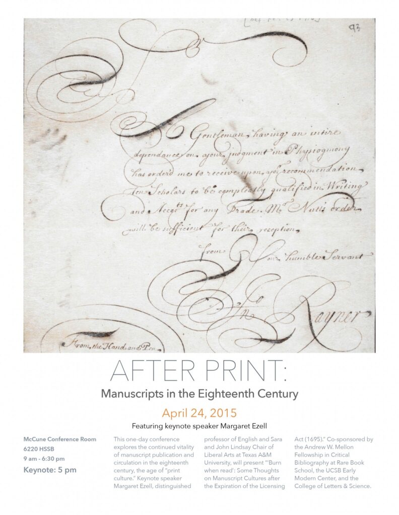 “After Print” will join this exciting subfield by exploring a range of manuscript practices in the long eighteenth century. Margaret Ezell, distinguished professor of English and Sara and John Lindsay Chair of Liberal Arts at Texas A&M University—whose works Social Authorship and the Advent of Print (1999) and The Patriarch’s Wife: Literary Evidence and the History of the Family (1987) have been foundational to the field—will deliver the keynote lecture. For more information, please contact Rachael Scarborough King (Asst. Prof., UCSB), rking@english.ucsb.edu. See the event website for additional details.