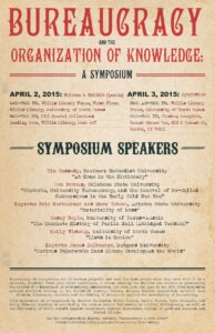 Apr 32015Bureaucracy and the Organization of Knowledge (RBS-Mellon Symposium)Presented by: The Andrew W. Mellon Fellowship of Scholars in Critical Bibliography at Rare Book School, the University of North Texas English Department, History Department, College of Arts and Sciences, and Honors College
