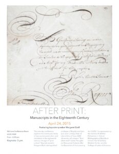 242015After Print: Manuscripts in the Eighteenth Century (RBS-Mellon Conference)Presented by: The Andrew W. Mellon Fellowship of Scholars in Critical Bibliography at Rare Book School and the UCSB Early Modern Center