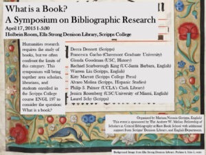 Holbein Room, Ella Strong Denison Library, Scripps CollegeHumanities research requires the study of books, but we often confront the limits of this category. This symposium will bring together area scholars, librarians, and students enrolled in the Scripps College course ENGL 197 to consider the question: What is a book?