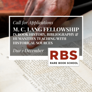 ZoomThe M. C. Lang Fellowship in Book History, Bibliography, and Humanities Teaching with Historical Sources is now accepting applications. Prospective applicants are invited to attend an informational session via Zoom on Wednesday, 29 October 2025 to learn more about the Lang Fellowship and the application process. This informational session will include an opportunity for Q&A with Rare Book School’s Director of Programs & Education Laura Perrings and Admissions Officer Andrew Rivard Hill. Click here to register for the Zoom link.