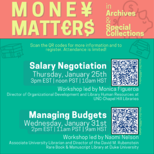 ZoomRare Book School’s Mellon Fellows for Diversity, Inclusion & Cultural Heritage invite you to a two-part, virtual workshop series on salary negotiation and managing funds and budgets.